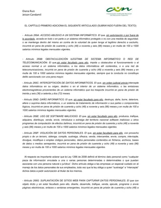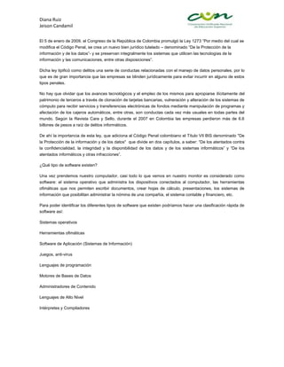La ley 1273 de Colombia tipifica delitos relacionados con el manejo de datos personales y sistemas informáticos. Adiciona un título al código penal con dos capítulos que describen conductas como acceso abusivo a sistemas, daño informático, violación de datos personales, hurto por medios informáticos y transferencia no consentida de activos. Las empresas deben adecuar sus contratos, políticas y capacitaciones para proteger la información de acuerdo con esta ley.