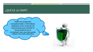 El documento define el software como conjuntos de instrucciones que controlan el funcionamiento de un computador para realizar tareas específicas. Explica que el software es un bien inmaterial protegido por derechos de autor, los cuales protegen su forma de expresión pero no las ideas subyacentes. Además, señala que el Tratado de la OMPI sobre Derecho de Autor actualizó los derechos de autores para adaptarse a la sociedad de la información e incluyó el derecho exclusivo de alquiler de software.
