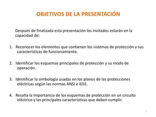 El documento describe los componentes y características clave de los sistemas de protección eléctrica. Explica que los sistemas de protección deben operar de manera rápida, selectiva y automática para aislar fallas y evitar daños, y que cuentan con respaldos locales y remotos para garantizar su funcionamiento. También identifica los elementos básicos de un sistema de protección como transformadores de instrumentación, relés y breakers.