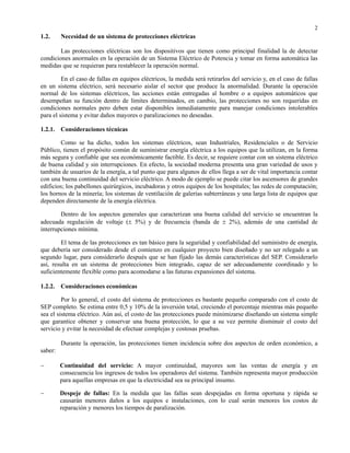 Este documento describe la necesidad y características de los sistemas de protección eléctrica. Explica que los sistemas de protección detectan condiciones anormales y toman medidas para restaurar la operación normal, mejorando la seguridad y confiabilidad del suministro eléctrico. Las características deseables de un sistema de protección incluyen confiabilidad, selectividad, rapidez, exactitud, sensibilidad, zonas de operación superpuestas y protección de respaldo. Finalmente, se resumen los tipos más comunes