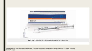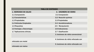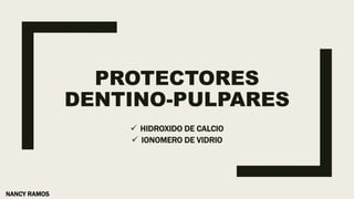 El documento describe dos tipos de protectores dentinopulpares: el hidróxido de calcio y el ionómero de vidrio. El hidróxido de calcio es un polvo blanco con propiedades alcalinas y bactericidas que induce la remineralización de la dentina y estimula la cicatrización pulpar. El ionómero de vidrio se compone de polvos de vidrio y una solución de copolímero ácido que reaccionan químicamente para formar enlaces iónicos con la dentina. Ambos materiales cumplen