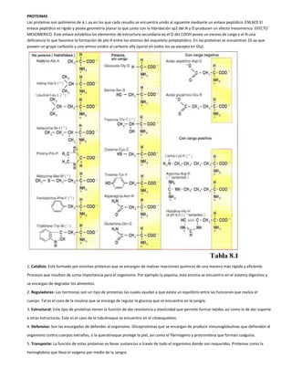 El documento describe las características estructurales y funcionales de las proteínas. Explica que están formadas por cadenas de aminoácidos unidos por enlaces peptídicos, y que pueden tener estructuras primarias, secundarias, terciarias y cuaternarias. También describe los diferentes tipos de proteínas según su función, como proteínas catalíticas, reguladoras, estructurales, de defensa, transporte y receptoras.