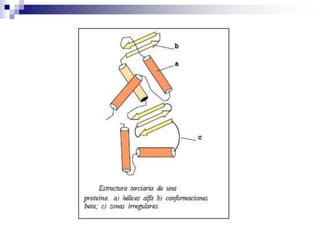 Las proteínas son macromoléculas formadas por aminoácidos, con funciones específicas que se determinan por su estructura primaria, la cual a su vez afecta a sus niveles estructurales superiores. Los aminoácidos esenciales deben obtenerse de la dieta y se conectan entre sí a través de enlaces peptídicos para formar péptidos y proteínas, que pueden clasificarse según su forma y función. La desnaturalización de las proteínas puede resultar en la pérdida de su funcionalidad, y estas realizan diversas funciones en los organismos, incluyendo roles estructurales y enzimáticos.