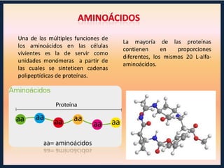 Este documento describe las funciones y propiedades de los aminoácidos y las proteínas. Explica que los aminoácidos son los monómeros que se polimerizan para formar cadenas proteicas. Describe los 20 aminoácidos comunes en las proteínas y clasifica 8 como esenciales y 12 como no esenciales. Además, explica las estructuras primaria, secundaria, terciaria y cuaternaria de las proteínas.