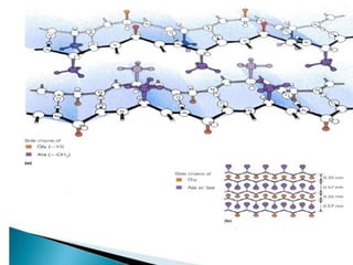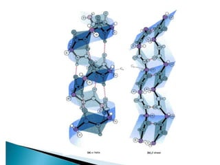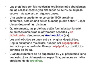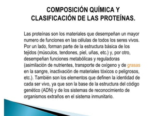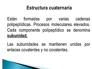 Las proteínas se pueden clasificar según su forma en fibrosas, globulares y mixtas. Las fibrosas como la queratina y el colágeno tienen cadenas polipeptídicas insolubles en agua. Las globulares como las enzimas y las hormonas se caracterizan por doblar sus cadenas en una forma esférica hidrofílica y hidrófoba. Las proteínas mixtas tienen una parte central fibrilar y extremos globulares.