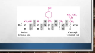 Las proteínas son biomoléculas formadas por la unión de aminoácidos mediante enlaces peptídicos. Existen distintos niveles de estructuración de las proteínas, desde la estructura primaria que es la secuencia lineal de aminoácidos, hasta la estructura cuaternaria que es la asociación de subunidades proteicas. Las proteínas cumplen funciones esenciales y diversas en el cuerpo.