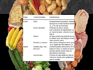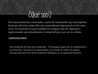 Las proteínas son macromoléculas construidas a partir de aminoácidos que cumplen funciones estructurales, de transporte, defensa, hormonales y catalíticas en los seres vivos. Los aminoácidos son los bloques de construcción de las proteínas y existen aminoácidos esenciales que el cuerpo no puede sintetizar y deben obtenerse a través de la dieta. Las proteínas cumplen diversas funciones importantes como el transporte de sustancias, la defensa del organismo, la contracción muscular y la catalización