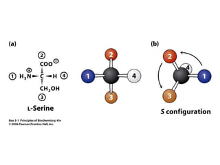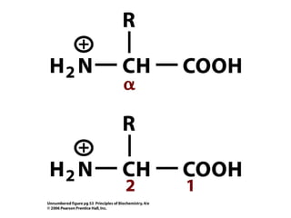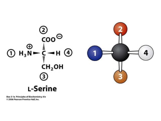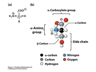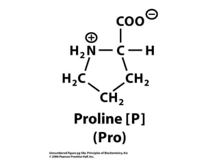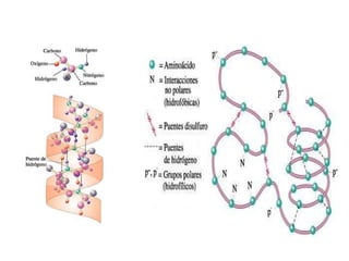 Este documento resume las propiedades y estructuras fundamentales de las proteínas. Las proteínas son macromoléculas compuestas por aminoácidos que cumplen funciones esenciales en los procesos biológicos. Su estructura primaria es la secuencia lineal de aminoácidos, mientras que las estructuras secundaria, terciaria y cuaternaria determinan su forma tridimensional mediante uniones como puentes de hidrógeno. Cambios en la secuencia o estructura pueden afectar la función de proteínas como la hem