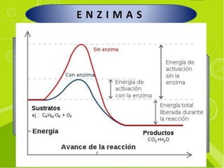 Este documento habla sobre las enzimas. Resume que las enzimas son proteínas especializadas que modifican reacciones químicas en el cuerpo para mantener un pH neutro y temperaturas moderadas sin liberaciones bruscas de energía. Las enzimas actúan de manera específica en un sustrato y tienen un centro activo que causa una reacción. Se clasifican en diferentes tipos como oxidorreductasas, transferasas e hidrolasas. Pueden ser afectadas por activadores, inhibidores o moduladores.