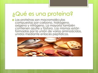 Las proteínas son macromoléculas esenciales compuestas por aminoácidos que desempeñan funciones vitales en los seres vivos, incluyendo estructuras celulares y funciones metabólicas. Su estructura se clasifica en cuatro niveles: primaria, secundaria, terciaria y cuaternaria, cada uno determinando su forma y función. La desnaturalización de una proteína implica la pérdida de su estructura terciaria, lo que puede afectar su solubilidad y actividad biológica.