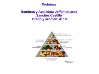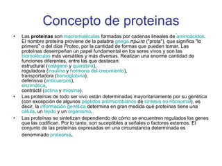 Este documento describe las proteínas, incluyendo su estructura, función y fuentes alimenticias. Las proteínas están compuestas de cadenas de aminoácidos y desempeñan funciones estructurales, reguladoras, de transporte y defensa en los seres vivos. Los principales alimentos ricos en proteínas son la carne, el pescado, los productos lácteos y los huevos. Las proteínas pueden desnaturalizarse y perder su forma tridimensional cuando se ven afectadas por factores externos como el calor.