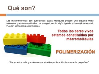 Este documento describe las macromoléculas llamadas proteínas. Explica que están compuestas por cadenas de aminoácidos unidos por enlaces peptídicos y adoptan estructuras secundarias, terciarias y cuaternarias. También clasifica los aminoácidos y describe las diferentes estructuras y funciones de las proteínas, como funciones estructurales, enzimáticas y de transporte.