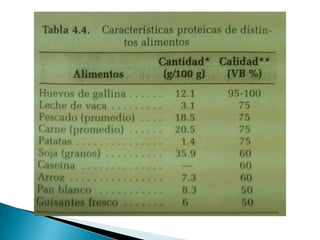 Este documento describe las proteínas, incluyendo su composición, clasificación, función y valor nutricional. Explica que las proteínas están formadas por aminoácidos y cumplen funciones estructurales, de control genético e inmunidad. También analiza factores como el valor biológico, digestibilidad y utilización neta de proteínas.