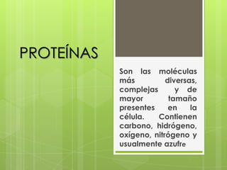 Las proteínas son las moléculas más diversas, complejas y grandes presentes en las células. Cumplen funciones como catalizadores, transporte de moléculas, defensa contra infecciones y componentes estructurales. Están compuestas de aminoácidos unidos por enlaces peptídicos y tienen niveles de estructura primaria, secundaria, terciaria y cuaternaria.