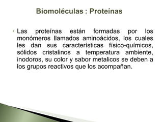 Las proteínas son polímeros formados por cadenas de aminoácidos unidos por enlaces peptídicos. Cumplen funciones estructurales, enzimáticas, de transporte, información genética, protección, contracción muscular y regulación. Existen proteínas simples y complejas con estructuras primarias, secundarias, terciarias y cuaternarias que determinan su forma y función.