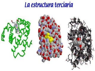 El documento describe las proteínas y su estructura. Define las proteínas como biopolímeros compuestos por aminoácidos. Explica que las proteínas cumplen múltiples funciones en el cuerpo como transporte de vitaminas y desempeño de funciones estructurales y catalíticas. Clasifica las proteínas según su función biológica en enzimas, de almacenamiento, reguladoras, estructurales, protectoras, de transporte y contráctiles. También describe las fuerzas como enlaces químicos y déb
