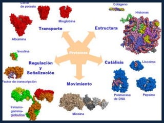 Este documento describe las funciones y propiedades de los aminoácidos y las proteínas. Explica que los aminoácidos son los monómeros que se polimerizan para formar cadenas polipeptídicas que componen las proteínas. También enumera los 20 aminoácidos comunes que se encuentran en las proteínas y clasifica algunos como esenciales y otros como no esenciales. Además, describe las diferentes estructuras que pueden adoptar las proteínas, como la estructura primaria, secundaria, terciaria y