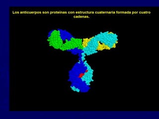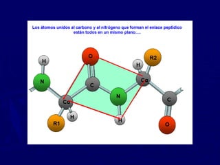 Las proteínas están compuestas de cadenas de aminoácidos cuya secuencia determina su estructura y función. Existen cuatro niveles de estructura proteica: primaria dada por la secuencia de aminoácidos, secundaria conformada por alfa hélices y hojas plegadas, terciaria definida por la configuración tridimensional de las cadenas laterales, y cuaternaria resultante de la unión de múltiples cadenas polipeptídicas. Las proteínas globulares solubles cumplen funciones dinámicas mientras que