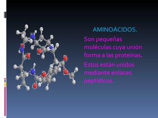 Las proteínas son biomoléculas orgánicas compuestas principalmente por carbono, hidrógeno, oxígeno y nitrógeno. Están formadas por aminoácidos unidos mediante enlaces peptídicos. Existen aminoácidos esenciales y no esenciales para la nutrición. Las proteínas tienen estructura primaria, secundaria, terciaria y cuaternaria. Cumplen funciones reguladoras, energéticas, contráctiles y de transporte.