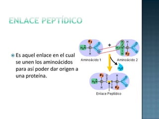 Las proteínas son biomoléculas formadas por aminoácidos que cumplen funciones esenciales. Se organizan en estructuras primarias, secundarias, terciarias y cuaternarias. Los aminoácidos se unen mediante enlaces peptídicos para formar péptidos y proteínas. Existen aminoácidos esenciales y no esenciales. Las proteínas están determinadas por los genes y errores en su síntesis pueden causar enfermedades.
