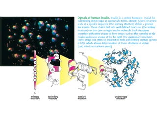 Este documento describe las diferentes estructuras de las proteínas, incluyendo la estructura primaria (cadena de aminoácidos), secundaria (patrones de hélice alfa y hojas beta), terciaria (plegamiento de la cadena en una forma tridimensional) y cuaternaria (proteínas compuestas de múltiples cadenas o subunidades). También describe elementos estructurales como motivos, dominios, asas y giros que permiten el plegamiento de la cadena en su forma nativa tridimensional.