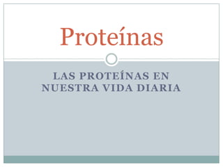 Las proteínas son moléculas formadas por cadenas de aminoácidos que desempeñan funciones vitales. Son indispensables para el crecimiento y realizan diversas funciones. El consumo recomendado diario es de 0.8 gramos por kilogramo de peso, aunque los europeos consumen el triple. Los alimentos de origen animal como la carne y el queso son los que más proteínas contienen.