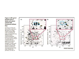 El documento describe la proteómica como el estudio y comprensión de los sistemas biológicos a través del análisis de las proteínas. Explica que la proteómica ofrece una visión integrada de las proteínas en un proceso biológico, mostrando información como las modificaciones postraduccionales que no pueden predecirse a partir de la secuencia de ADN. También describe los objetivos sistemáticos y pragmáticos de la proteómica y algunas de sus aplicaciones en medicina, toxicología