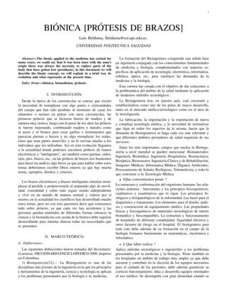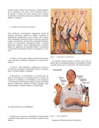 Este documento describe la evolución de las prótesis a lo largo de la historia y el estado actual de las prótesis de brazos. Explica que las primeras prótesis eran muy rudimentarias, pero que con el tiempo se han ido mejorando los materiales e incorporando electrónica para lograr prótesis más funcionales. Actualmente existen prótesis de brazos inteligentes que pueden imitar muchas funciones del brazo real. Sin embargo, estos avances tecnológicos aún no están disponibles para todas las personas debido a su alto costo.