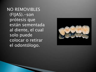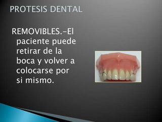 El documento describe diferentes tipos de prótesis dentales, incluyendo prótesis removibles que pueden colocarse y retirarse por uno mismo, prótesis fijas que solo pueden colocar o retirar un odontólogo, prótesis totales para toda la mandíbula superior o inferior, y prótesis parciales para cuando faltan solo algunos dientes. También menciona prótesis soportadas por implantes quirúrgicos.