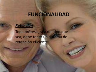 La funcionalidad de las prótesis dentales depende de su retención y estabilidad para soportar las estructuras de la boca. Existen diferentes materiales como metal, cerámica y resina para su fabricación. Los tipos de prótesis incluyen las removibles como las de resina o esqueléticas que el paciente puede colocar y quitar, y las no removibles como las fijas que sólo puede colocar y quitar el odontólogo.