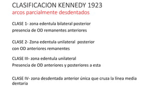 Este documento describe diferentes tipos de prótesis parciales removibles, incluyendo su clasificación, materiales de impresión, y componentes. Explica las clases de Kennedy y las reglas de Applegate para la clasificación de prótesis parciales, así como los diferentes tipos de conectores mayores y menores utilizados en prótesis superiores e inferiores. También cubre conceptos como la ley de ante y los principios de diseño para lograr retención, soporte, estabilidad y funcionalidad.
