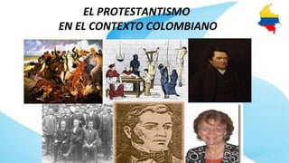 Este documento resume brevemente la historia del protestantismo en Colombia. Menciona que los primeros protestantes llegaron en el siglo XVI pero fueron perseguidos por la Inquisición. En el siglo XIX llegaron más misioneros presbiterianos, metodistas y pentecostales, estableciendo iglesias a pesar de la oposición del gobierno conservador. Para 1930 el partido liberal tomó el poder y permitió más libertad religiosa y crecimiento del protestantismo.