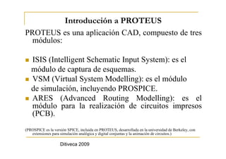 El documento presenta una introducción al software Proteus. Proteus consta de tres módulos: ISIS para el diseño de esquemas, VSM para simulación y ARES para diseño de circuitos impresos. Se describe brevemente el proceso de instalación de Proteus y sus principales características como la barra de título, menús, área de trabajo y herramientas. Finalmente, se indica que el próximo capítulo explicará el desarrollo del primer circuito y el uso de las herramientas.