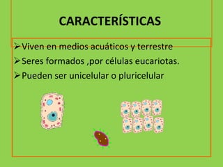 Los protistas son seres unicelulares o pluricelulares eucariotas que pueden vivir en medios acuáticos o terrestres. Algunos son autótrofos y realizan fotosíntesis, mientras que otros son heterótrofos. Se reproducen de forma asexual o sexual, y cumplen funciones ecológicas importantes como parte del plancton y del bentos.