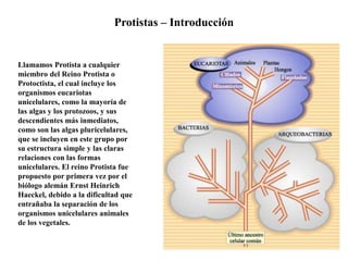 El documento proporciona información sobre el reino Protista. Los protistas son organismos eucariotas unicelulares o pluricelulares simples que incluyen algas y protozoos. Se caracterizan por tener células eucariotas con organelas como mitocondrias, cloroplastos y corpúsculos basales. Algunos son autótrofos por fotosíntesis mientras que otros son heterótrofos por ingestión u absorción. Los protistas exhiben diversas formas de nutrición, reproducción y movilidad.