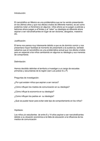 Este documento presenta un protocolo de investigación sobre los factores que motivan a los niños entre 8 y 14 años a aspirar a ser narcotraficantes. El estudio analizará características de niños en escuelas primarias y secundarias de San Luis Potosí y examinará cómo la situación económica, la falta de educación y la influencia de medios de comunicación afectan su ideología. El objetivo es informar sobre los principales factores que influyen en esta aspiración e identificar diferencias entre aquellos niños que la presentan y