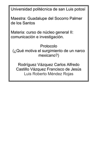 Este documento presenta un protocolo de investigación sobre los factores que motivan a los niños entre 8 y 14 años a aspirar a ser narcotraficantes. El estudio analizará características de niños en escuelas primarias y secundarias de San Luis Potosí y examinará cómo la situación económica, la falta de educación y la influencia de medios de comunicación afectan su ideología. El objetivo es informar sobre los principales factores que influyen en esta aspiración e identificar diferencias entre aquellos niños que la presentan y