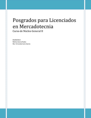 Este documento presenta una investigación sobre las opciones de posgrados disponibles para licenciados en mercadotecnia. Incluye una introducción, justificación, delimitación, preguntas e objetivos de investigación. También presenta un marco teórico sobre la importancia de realizar posgrados, los antecedentes históricos y el contexto actual. Finalmente, detalla el diseño de investigación propuesto para evaluar las diferentes opciones de posgrados a nivel estatal, nacional e internacional.