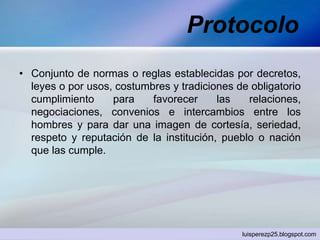 El documento describe los diferentes tipos de protocolo, incluyendo el protocolo público, de estado, militar, eclesiástico, deportivo e institucional. Explica que el protocolo establece las reglas, el ceremonial especifica las formalidades, la precedencia fija la posición, y la etiqueta distingue el acto con solemnidad y cortesía. También enumera elementos protocolares como el auditorio, podio, traje académico y principios como el orden, respeto y puntualidad.