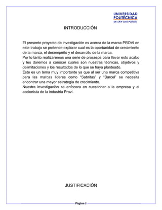 Este documento presenta un proyecto de investigación sobre la marca PROVI. El objetivo general es analizar las oportunidades de crecimiento y expansión de la marca. Se utilizarán técnicas como entrevistas a ejecutivos de la empresa y encuestas al público para identificar las estrategias y motivaciones de compra. La investigación se llevará a cabo de enero a mayo de 2014 en la empresa PROVI en San Luis Potosí.