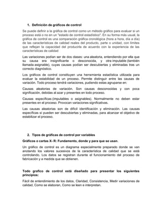 Este documento explica los gráficos de control por variables (gráficos X-R), incluyendo su definición, tipos, y cómo construirlos y analizarlos. Los gráficos X-R permiten evaluar si un proceso está bajo control estadístico mediante el monitoreo de datos a lo largo del tiempo y la identificación de puntos que caen fuera de los límites de control, lo que indica la presencia de causas especiales que deben ser investigadas. El documento proporciona instrucciones paso a paso para construir gráf