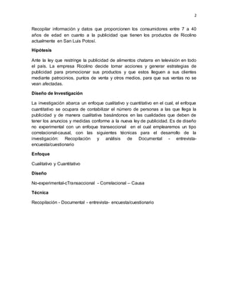 Este documento presenta un proyecto de investigación que analizará el impacto de la ley mexicana que restringe la publicidad de comida chatarra en televisión en la empresa Ricolino. El documento establece las preguntas de investigación, los objetivos, la hipótesis, el diseño de investigación cualitativo y cuantitativo, y el cronograma del proyecto. El objetivo general es analizar el impacto de la ley en Ricolino y los objetivos específicos son revisar las nuevas estrategias de marketing de Ricolino y rec