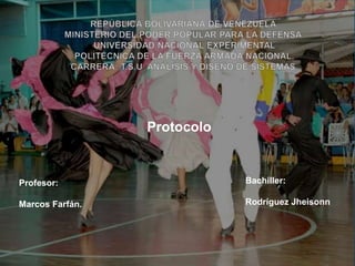 El documento describe las actividades del protocolo de una universidad en Venezuela en los años 2012-2013. Se desarrollaron talleres de maquillaje, postura y pasarela para estudiantes. También se realizaron campañas de entrega de juguetes y útiles escolares a niños en zonas rurales. En 2013 se gestionó un uniforme de gala para actividades dentro y fuera de la universidad. Actualmente el grupo de protocolo está compuesto por 20 estudiantes comprometidos que participan en eventos de la universidad y de empresas estatales.
