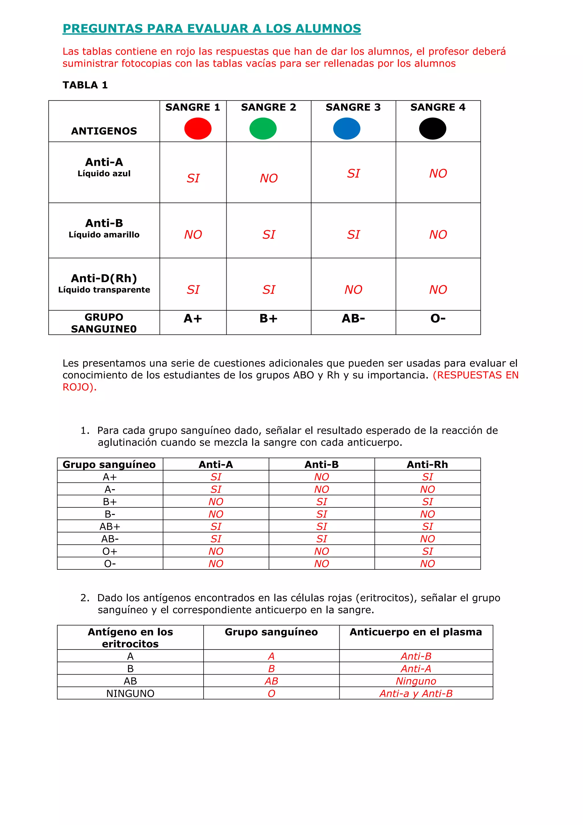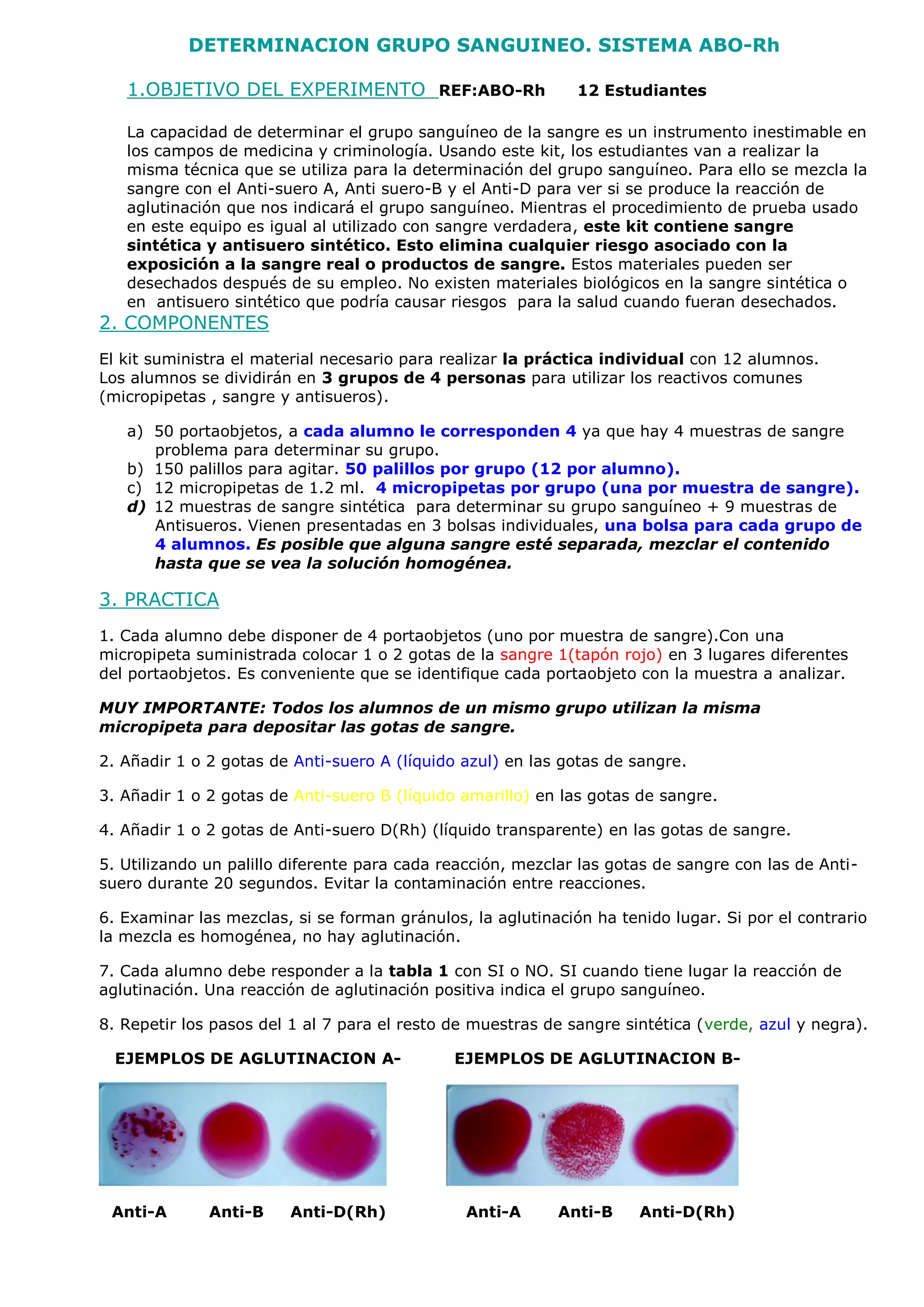 Este documento describe un experimento para que los estudiantes determinen el grupo sanguíneo usando sangre y antisueros sintéticos. El objetivo es practicar la técnica de determinación de grupo sanguíneo de manera segura sin riesgos biológicos. Los estudiantes se dividirán en grupos para analizar muestras de sangre sintética con diferentes antisueros y verificar si ocurre aglutinación, lo que indicaría el grupo sanguíneo. El documento incluye instrucciones detalladas sobre los pasos a seguir y tabl