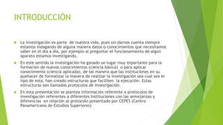Este documento compara los protocolos de investigación de varias instituciones como CEPES, CONACYT, OPS, Universidad de Tabasco, UNAM y la Universidad Veracruzana. Mientras que todos los protocolos cubren puntos como el título, objetivos, marco teórico y metodología, varían en su estructura y detalles incluidos. Por ejemplo, algunos incluyen un plan de análisis o presupuesto, mientras que otros separan distintos marcos o agregan secciones como recursos o cronogramas. En general, los protocol