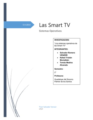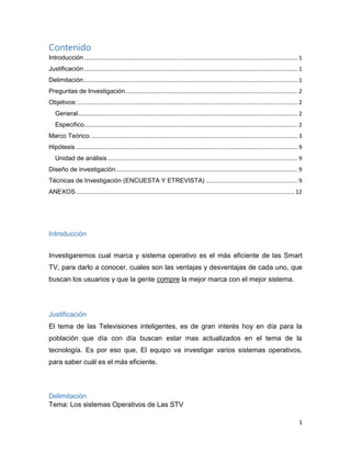 Este documento presenta un resumen de 3 oraciones de un proyecto de investigación sobre los sistemas operativos de las Smart TV. El proyecto evalúa las diferentes marcas de Smart TV para identificar cuál es la más eficiente. El equipo de investigación planea aplicar encuestas y entrevistas a estudiantes y profesores para determinar qué sistema operativo y marca es preferida por los usuarios.