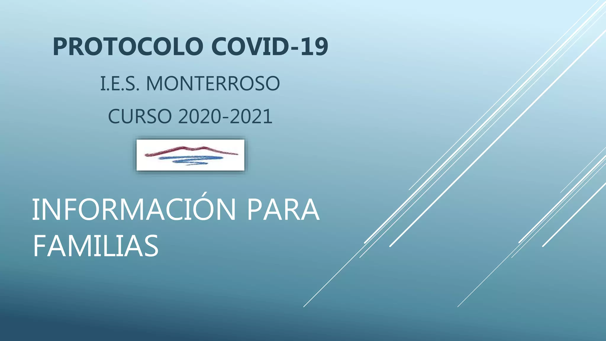 El protocolo COVID-19 del I.E.S. Monterroso para el curso 2020-2021 establece medidas estrictas de acceso y movilidad, higiene y actuación ante casos sospechosos o confirmados. Se enfatiza el uso obligatorio de mascarillas, la desinfección de espacios y el distanciamiento social, así como una atención especial al transporte escolar y la gestión de posibles brotes. En caso de un cierre de centros educativos, se implementarán aulas virtuales y horario específico para garantizar la continuidad educativa.
