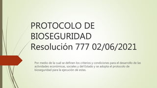 Este documento establece el protocolo de bioseguridad para la ejecución de actividades económicas, sociales y del Estado durante la pandemia. Orienta medidas de autocuidado como lavado de manos, distanciamiento físico, uso de tapabocas, ventilación, limpieza y desecho de residuos para reducir el riesgo de transmisión del virus. Aplica a todos los sectores públicos y privados del país para proteger la salud de los ciudadanos.