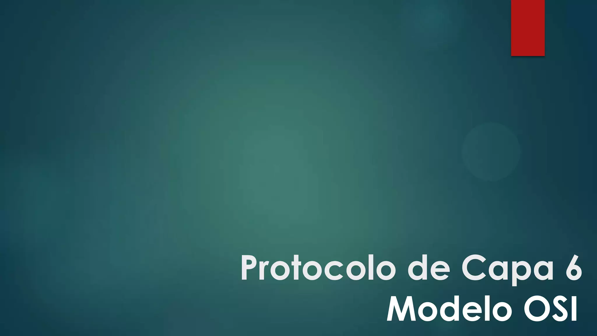 El protocolo de Capa 6 del Modelo OSI se encarga de la representación de la información para que los datos lleguen de manera reconocible aunque los equipos tengan diferentes representaciones internas. Permite formatear, cifrar y comprimir los datos actuando como traductor entre las diferentes representaciones. ASN.1 y MIME son protocolos importantes de esta capa que representan datos de forma independiente a la máquina y permiten el intercambio de todo tipo de archivos de forma transparente respectivamente.