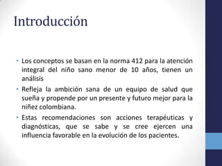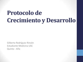 Este documento presenta un protocolo de crecimiento y desarrollo para niños menores de 10 años con el objetivo de brindar pautas para su atención integral con calidad. Incluye controles periódicos del niño sano, actividades de educación, promoción de la salud y prevención de enfermedades. También describe los instrumentos como la historia clínica y carné de salud, así como los insumos requeridos para la evaluación y atención de los niños.